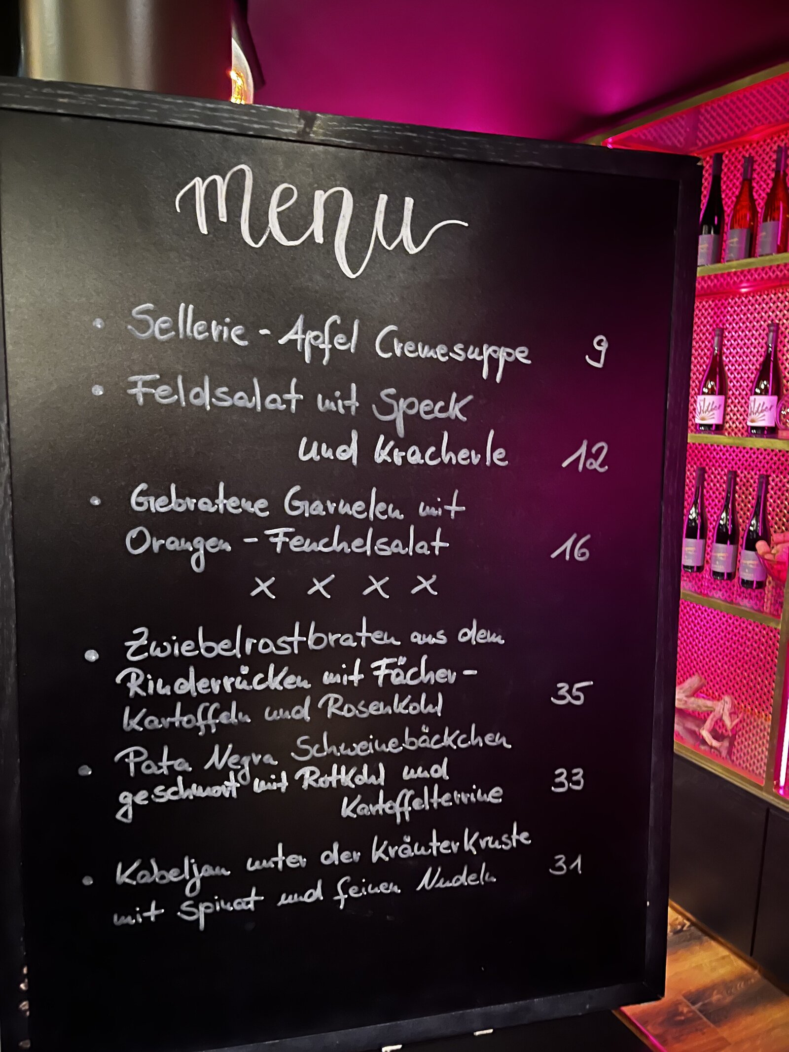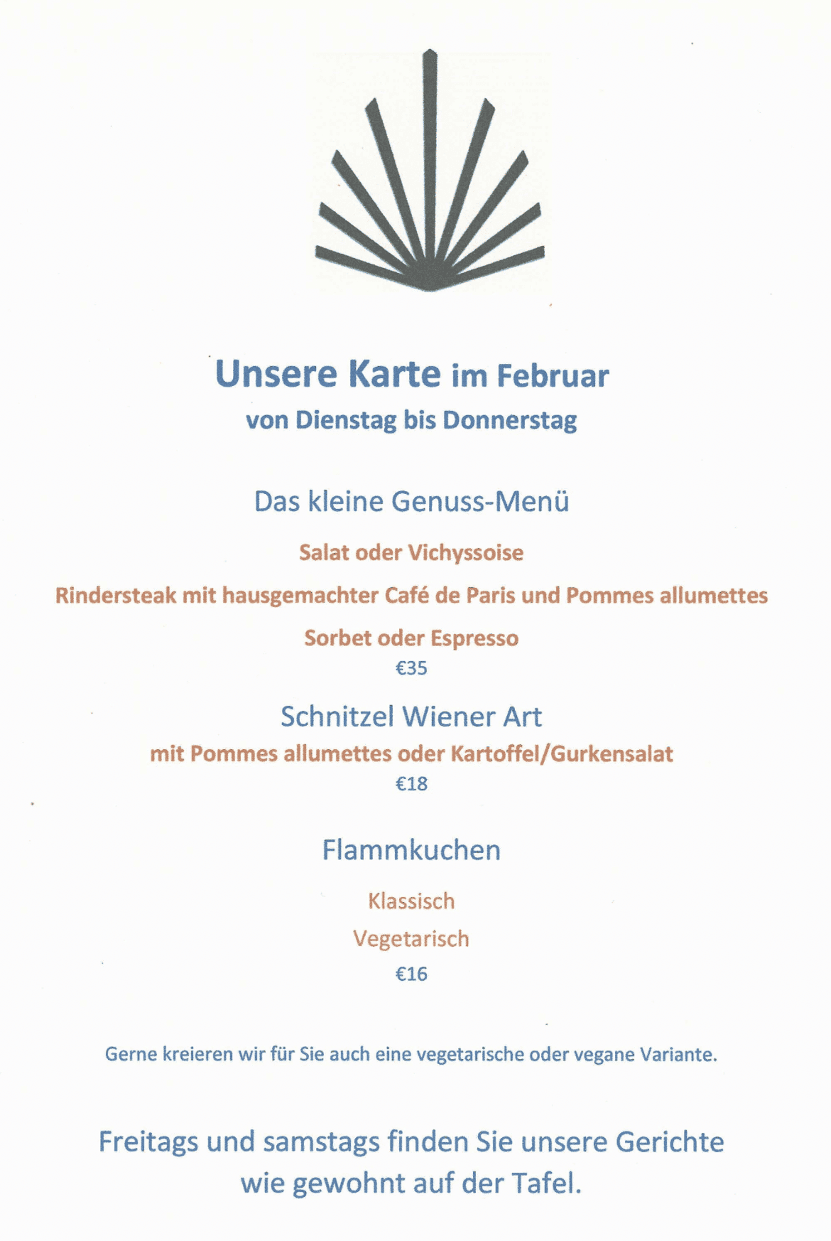 Sie werden hier keine klassische Speisekarte finden, da wir Ihnen wechselnd frisch zubereitete Vor- und Hauptspeisen sowie Desserts anbieten. Die derzeitigen Gerichte (ggf. mit tagesaktuellen Änderungen) finden Sie auf unserer Tafel.