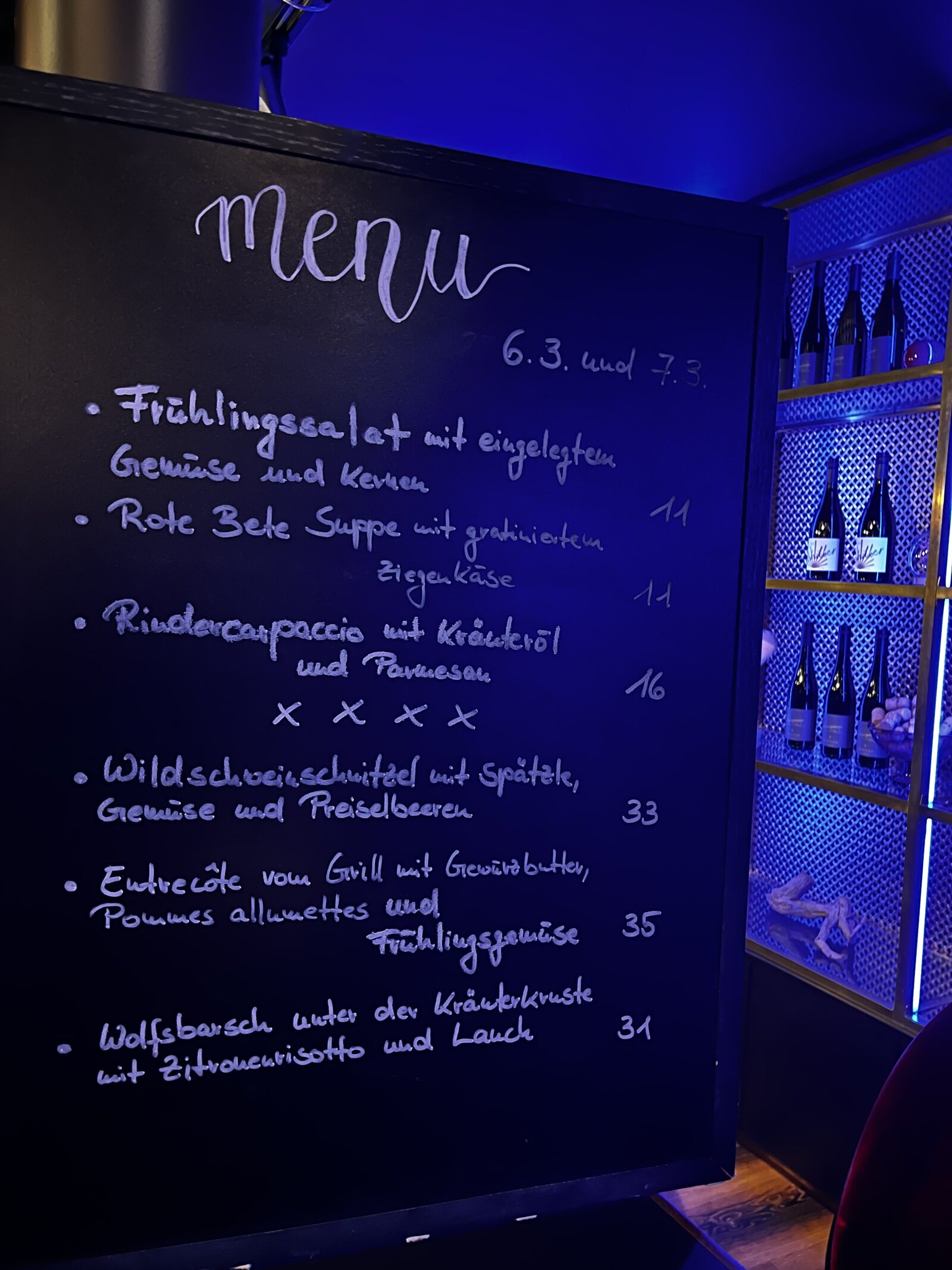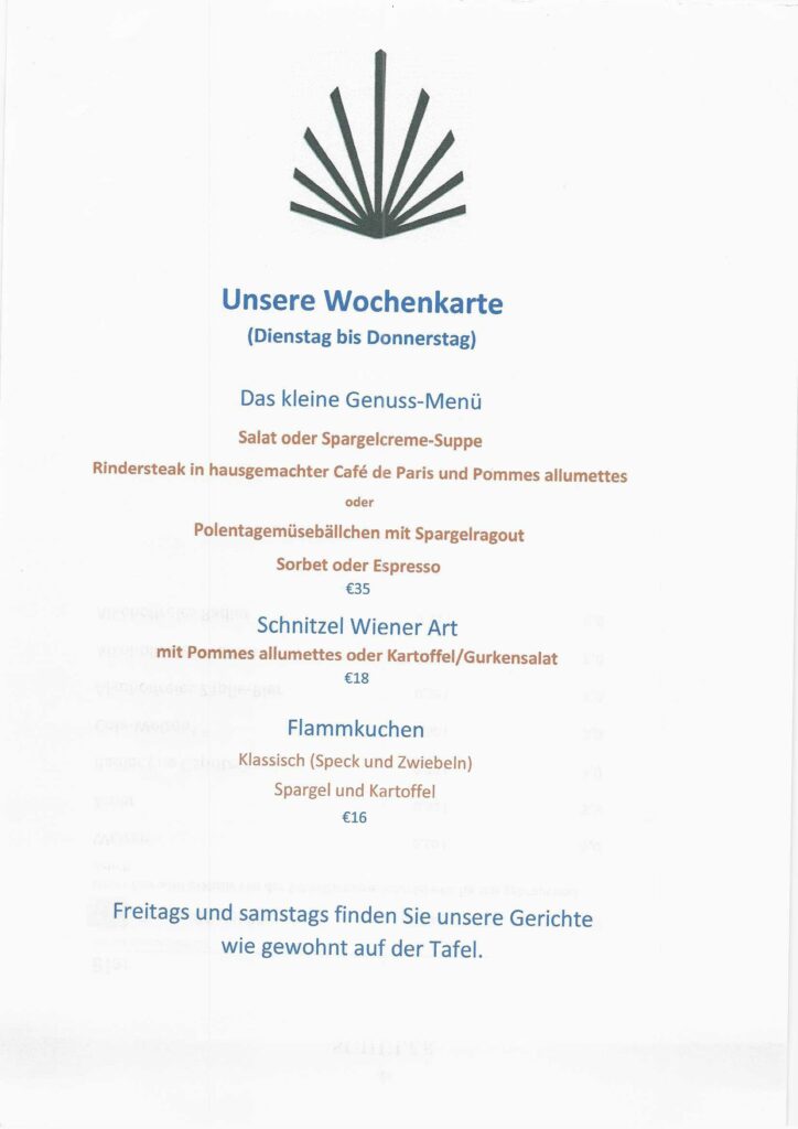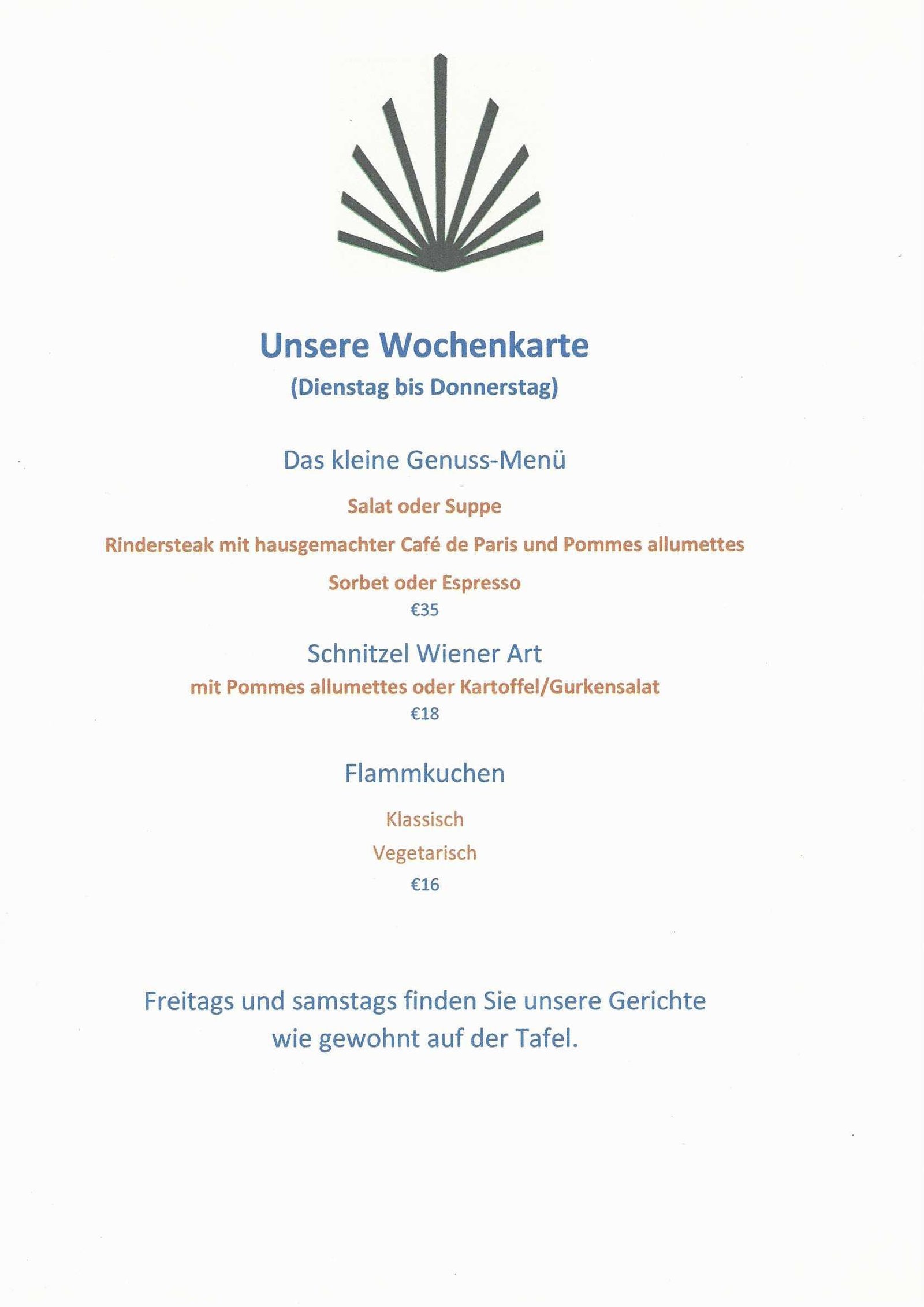 Freitags und samstags wandert unsere Tafel wie gewohnt von Tisch zu Tisch mit Gerichten wie z. B. Loup de Mer, Boeuf braisée und Entrecote. Diese Gerichte (ggf. mit tagesaktuellen Änderungen) finden Sie hier oder auf unserer Tafel im Restaurant.